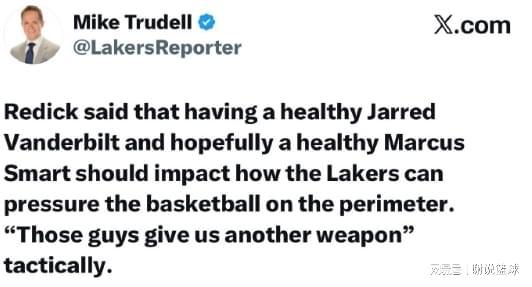 而在训练营开始以后,湖人可谓两喜一忧,首先主教练雷迪克接受采访,他直言当范德比尔特恢复健康,而且经过休赛期引援,尤其斯玛特买断后加盟,让雷迪克信心翻倍,他认为湖人外线防守压迫能力,会至少提升一个档次。